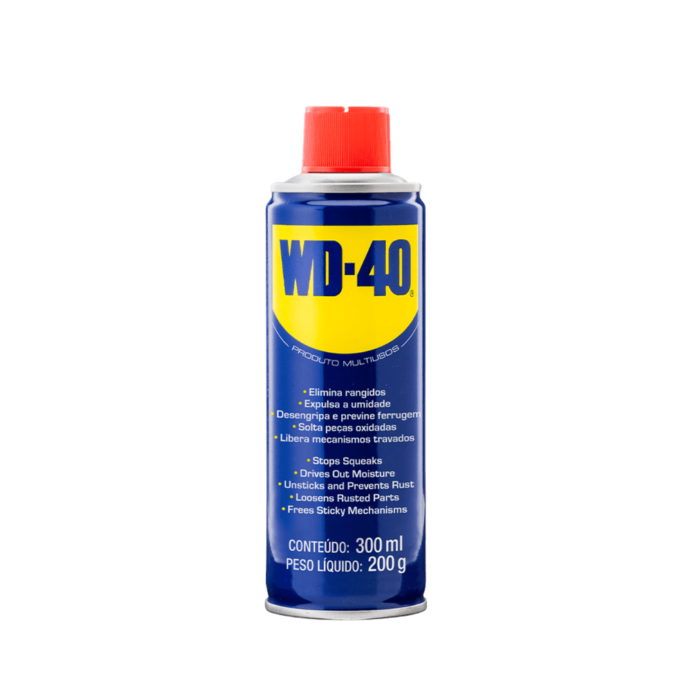WD-40® Produto Multiusos original previne ferrugem em peças metálicas, elimina a umidade e desemperra mecanismos de baixo atrito.